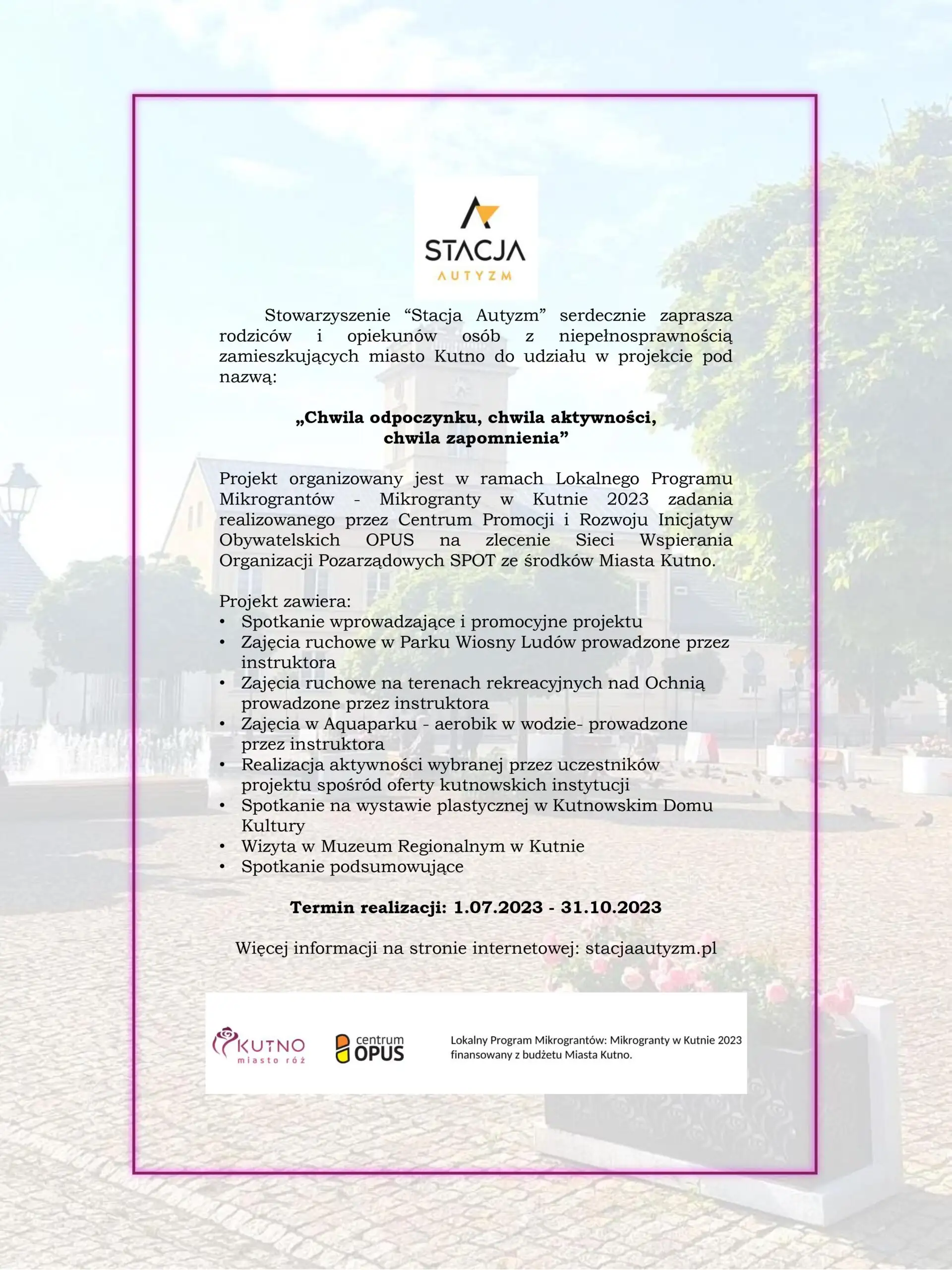 Jest nam niezmiernie miło poinformować, iż złożony przez Stowarzyszenie „Stacja Autyzm” wniosek pod tytułem „Chwila odpoczynku, chwila aktywności, chwila zapomnienia” w odpowiedzi na ogłoszony konkurs w ramach Lokalnego Programu Mikrograntów: MIKROGRANTY W KUTNIE 2023, znalazł się na liście laureatów czyli liście wniosków z dofinansowaniem.