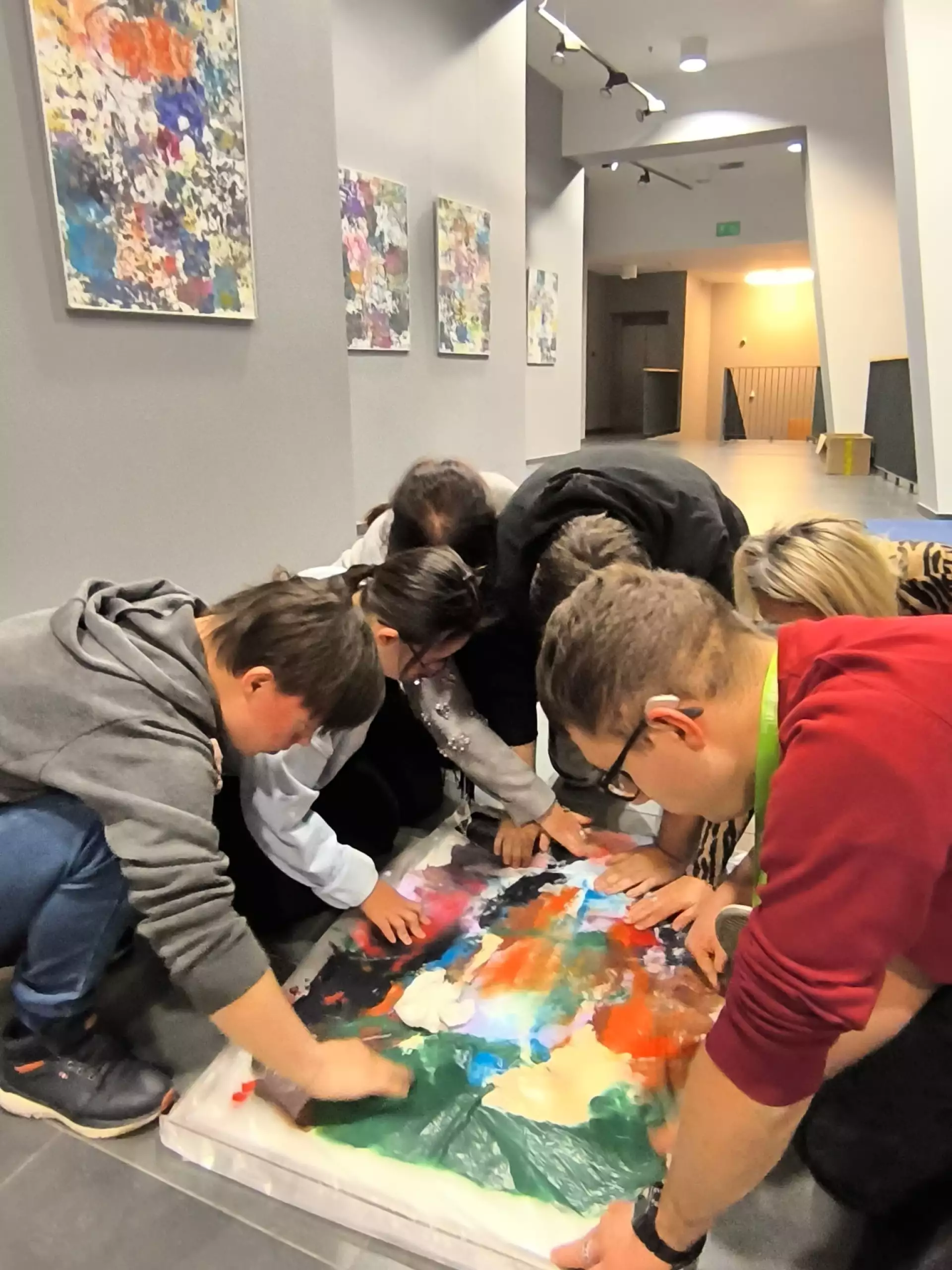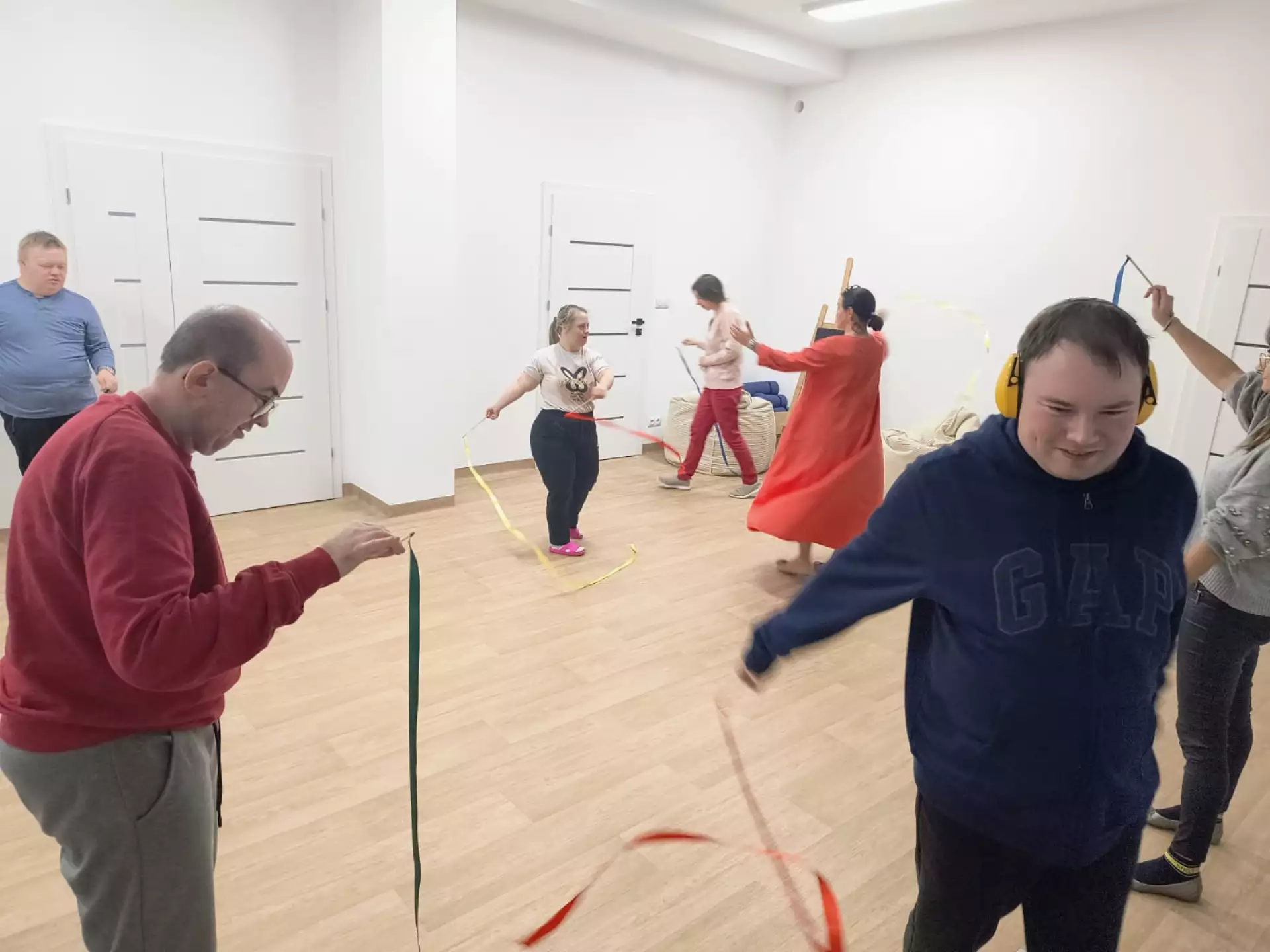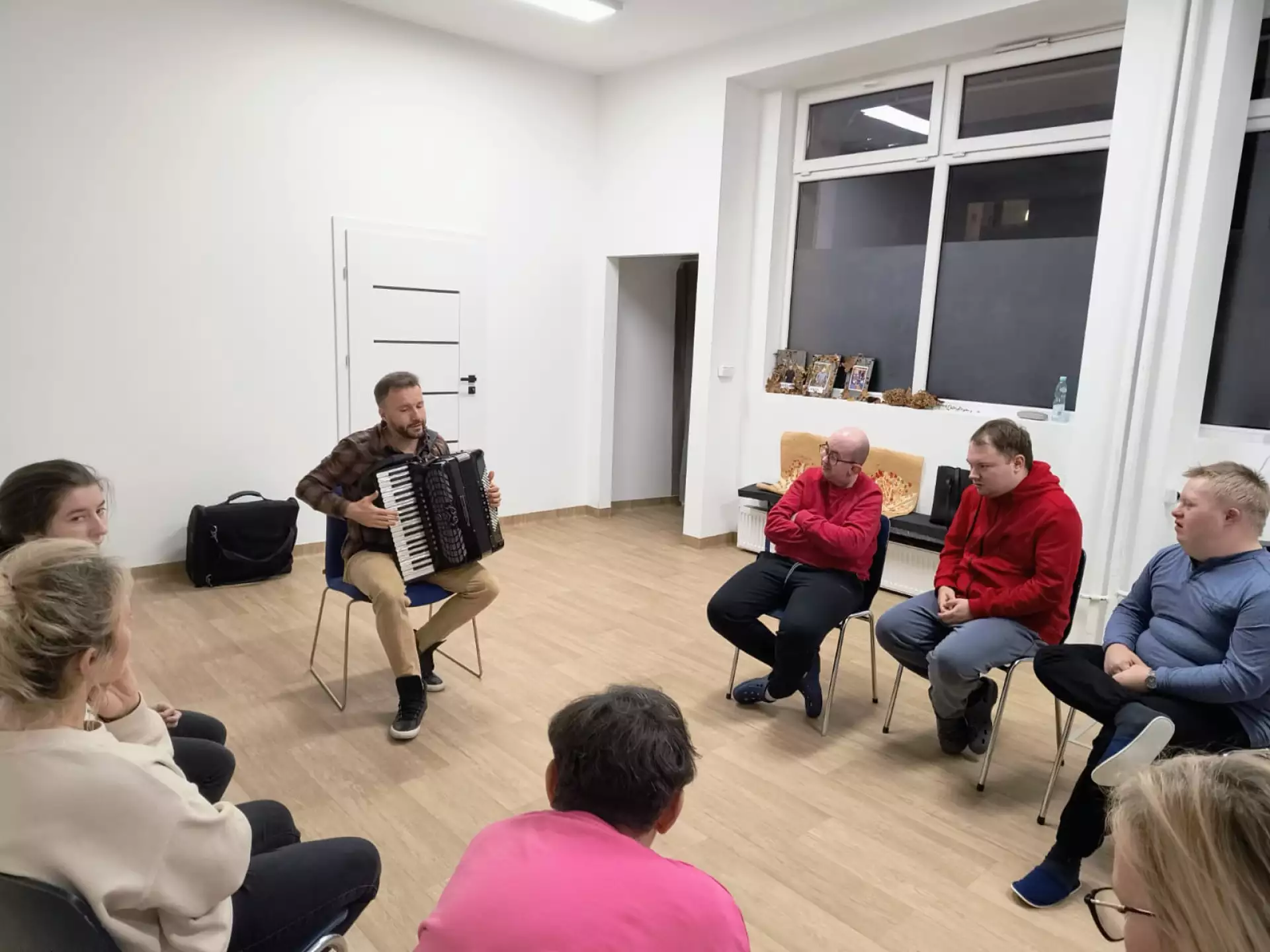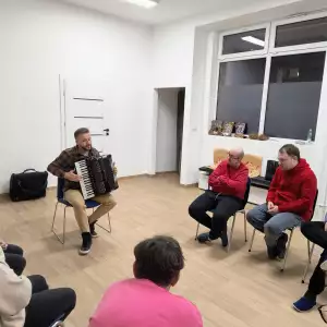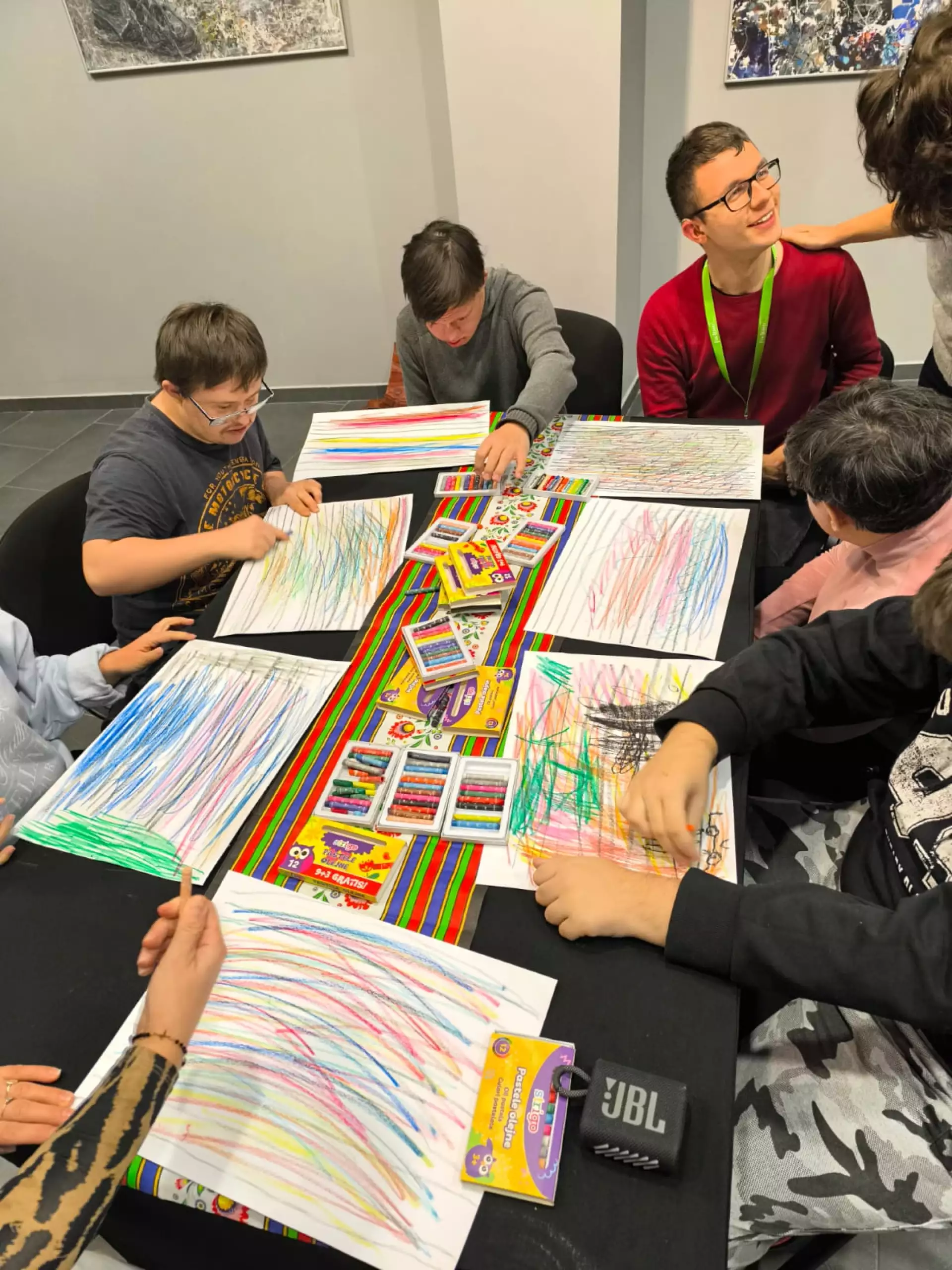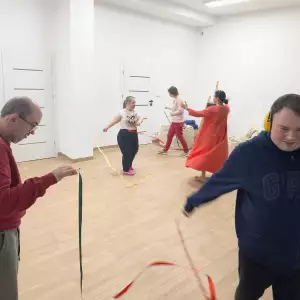 Młodzież i dorośli uczestnicy projektu przygotowywali się tym razem do wyjścia do kawiarni. Uczyli się jak dokonywać wyboru z oferty kawiarnianego menu, trenowali sposoby zamawiania, prostej konwersacji i inne społeczne sytuacje w czasie pobytu w kawiarni. Co ciekawe, najpierw sami wybrali lokal z listy znanych już sobie miejsc w naszym mieście. Wybór padł na otwartą tej jesieni Zieloną Zośkę, miejsce przyjazne sensorycznie, z ograniczoną ilością bodźców, możliwością wyboru muzyki i przystosowania miejsca do podobnych spotkań, co ma ogromne znaczenie dla uczestników zajęć. Druga, jesienna seria zajęć była zgodnie z założeniami projektu muzyczna i artystyczna i miała na celu przygotowanie wszystkich grup do udziału w koncercie sensorycznym. W tracie zajęć uczestnicy między innymi spotkali się z profesjonalnym muzykiem, mieli okazję poznać instrument, próbowali sami improwizować i doświadczyć niezwykłej emisji żywej muzyki. Jedno z takich spotkań było zorganizowane z okazji Święta Niepodległości, było zatem i muzycznie i patriotycznie. W grupie nie brakuje mistrzów instrumentów perkusyjnych, są też miłośnicy wspólnego śpiewania. Muzyka była w trakcie przebiegu całego cyklu zajęć, tłem do różnych ekspresji ruchowych, tanecznych, plastycznych i relaksacyjnych. Dzięki gościnności i współpracy z KDK, jedno ze spotkań udało się zorganizować w Galerii Okno na Sztukę w Kutnowskim Domu Kultury na wystawie „ Mowa linii”. Artystyczne linie prac z wystawy Bogumiła Gardolińskiego były bardzo inspirujące… Warto dodać, że Stowarzyszenie jest częstym gościem tej Galerii i po raz kolejny terapeuci wykorzystali jej otwartą przestrzeń do wspólnej pracy i terapii.