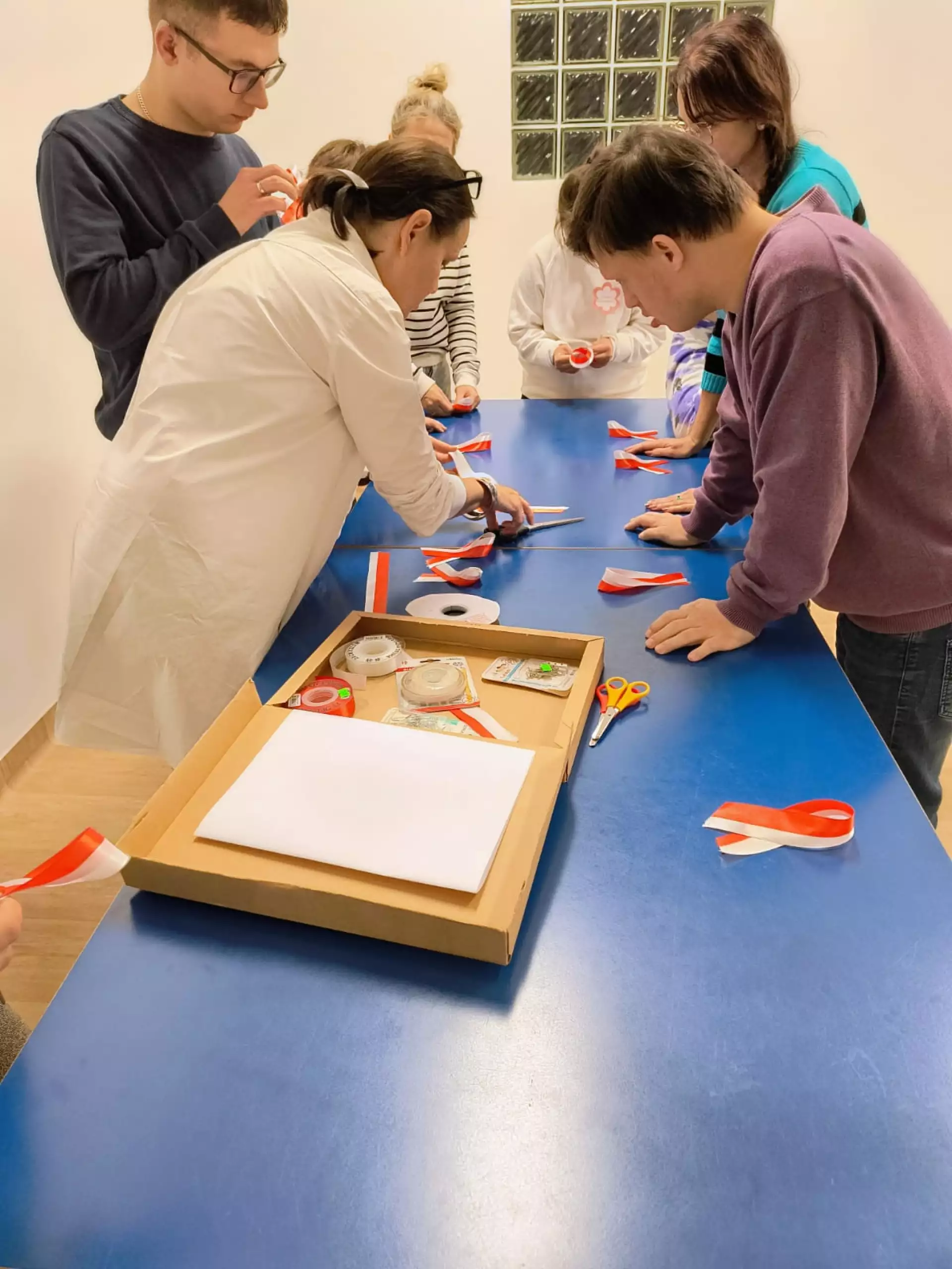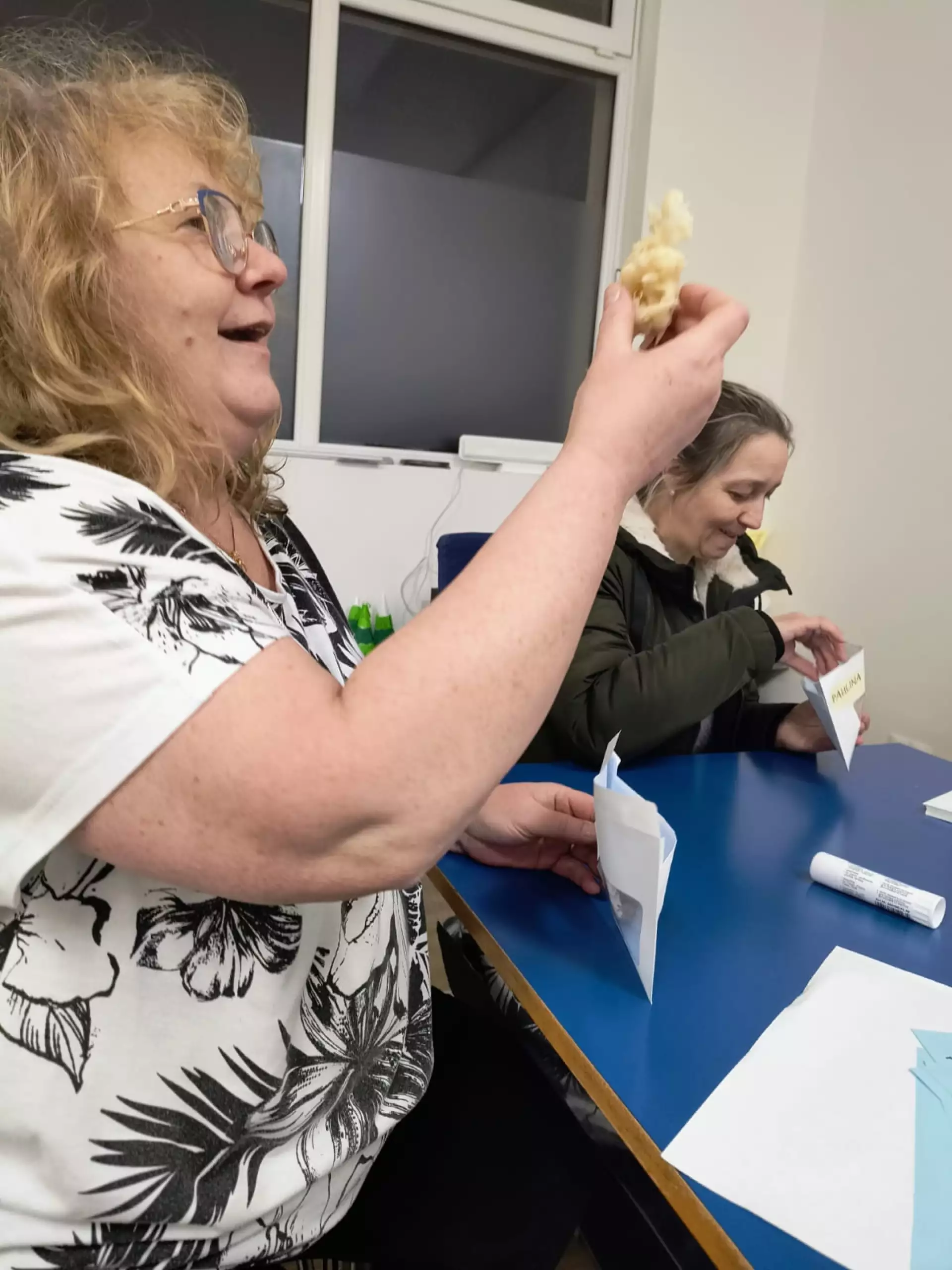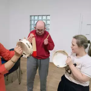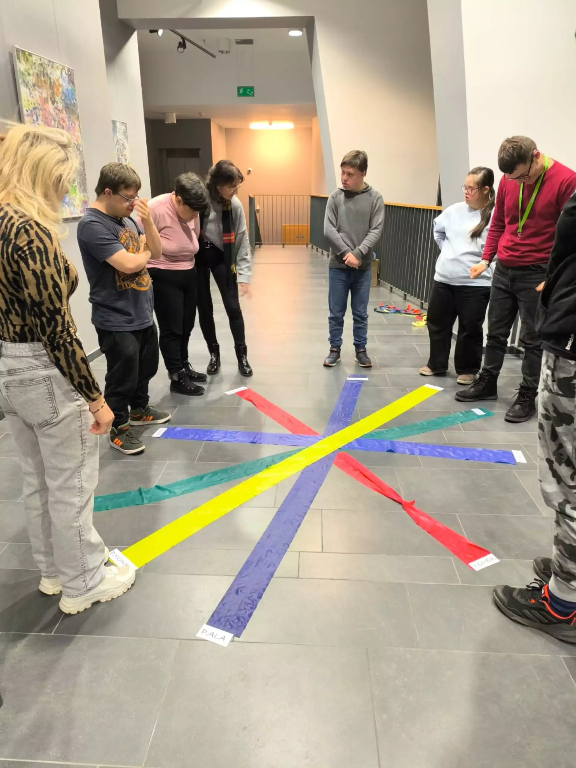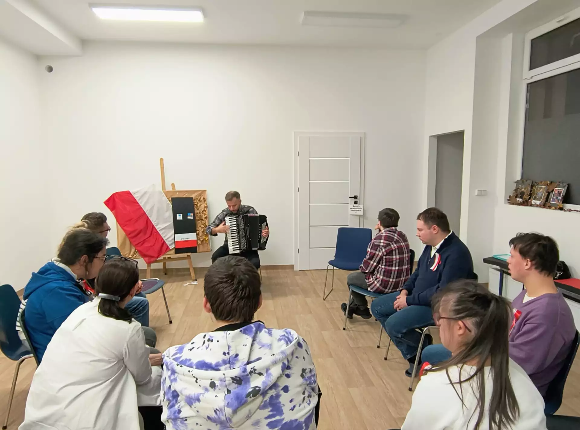Młodzież i dorośli uczestnicy projektu przygotowywali się tym razem do wyjścia do kawiarni. Uczyli się jak dokonywać wyboru z oferty kawiarnianego menu, trenowali sposoby zamawiania, prostej konwersacji i inne społeczne sytuacje w czasie pobytu w kawiarni. Co ciekawe, najpierw sami wybrali lokal z listy znanych już sobie miejsc w naszym mieście. Wybór padł na otwartą tej jesieni Zieloną Zośkę, miejsce przyjazne sensorycznie, z ograniczoną ilością bodźców, możliwością wyboru muzyki i przystosowania miejsca do podobnych spotkań, co ma ogromne znaczenie dla uczestników zajęć. Druga, jesienna seria zajęć była zgodnie z założeniami projektu muzyczna i artystyczna i miała na celu przygotowanie wszystkich grup do udziału w koncercie sensorycznym. W tracie zajęć uczestnicy między innymi spotkali się z profesjonalnym muzykiem, mieli okazję poznać instrument, próbowali sami improwizować i doświadczyć niezwykłej emisji żywej muzyki. Jedno z takich spotkań było zorganizowane z okazji Święta Niepodległości, było zatem i muzycznie i patriotycznie. W grupie nie brakuje mistrzów instrumentów perkusyjnych, są też miłośnicy wspólnego śpiewania. Muzyka była w trakcie przebiegu całego cyklu zajęć, tłem do różnych ekspresji ruchowych, tanecznych, plastycznych i relaksacyjnych. Dzięki gościnności i współpracy z KDK, jedno ze spotkań udało się zorganizować w Galerii Okno na Sztukę w Kutnowskim Domu Kultury na wystawie „ Mowa linii”. Artystyczne linie prac z wystawy Bogumiła Gardolińskiego były bardzo inspirujące… Warto dodać, że Stowarzyszenie jest częstym gościem tej Galerii i po raz kolejny terapeuci wykorzystali jej otwartą przestrzeń do wspólnej pracy i terapii.
